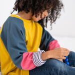 Kinderpulli Evan mit Raglanärmeln. Korpus gelb. Ärmel zweiteilig. Obere Farbe dunkelgrün, untere Farbe magenta. Halsbündchen und Ärmelbündchen dunkelgrün, Saumbündchen gelb. Ein Ärmel ist umgekrempelt und zeigt ein gestreiftes Futter mit dunkelblauen und weißen gleich großen Streifen.