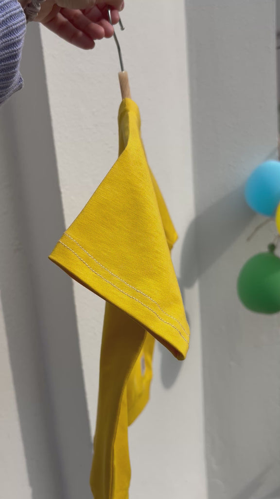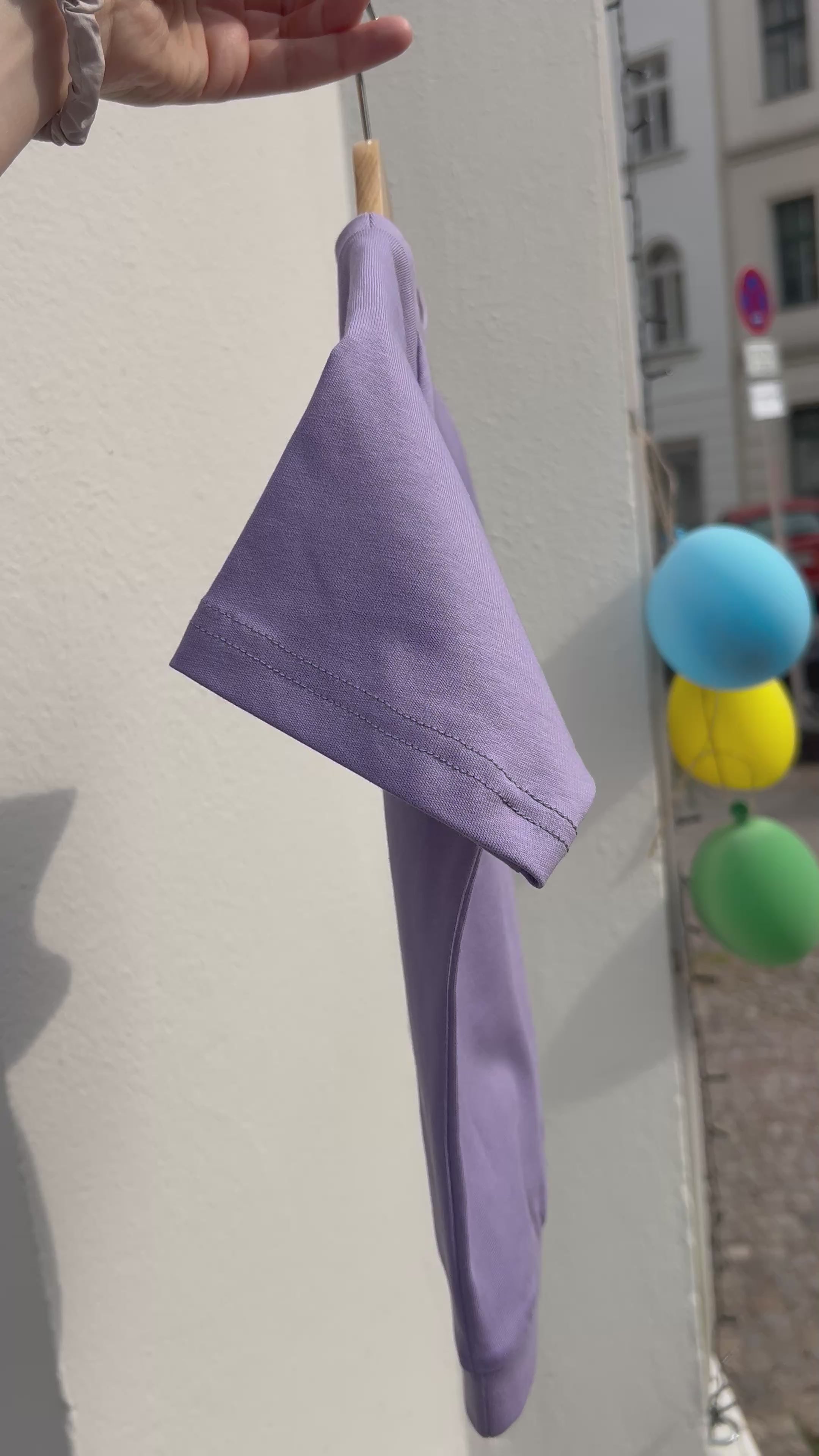 Wasche bei 30 °C (max. 40 °C) ohne Aufheller bei niedriger Schleuderdrehzahl. Schontrocknung empfohlen, danach bei Bedarf bei mittlerer Temperatur bügeln. Bio-Jersey kann beim Trocknen bis zu 2 cm einlaufen.