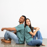 Ein Mann trägt eine Jeans und ein grünes Raglan Shirt der Marke Oktopulli